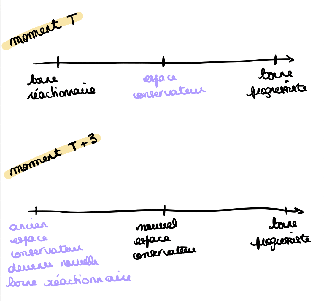 Notre frise du temps allant de gauche à droite, ce qui était une position conservatrice à un moment T, est devenue une position complÚtement réactionnaire à T+3