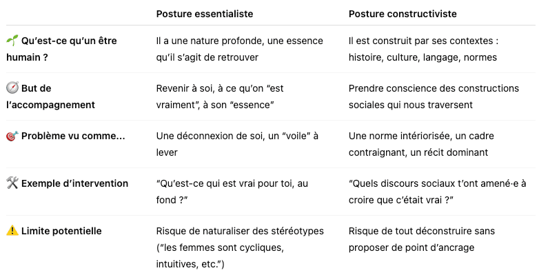 3️⃣ Exemple : Essentialisme vs Constructivisme – deux visions de l’humain… deux postures radicalement différentes